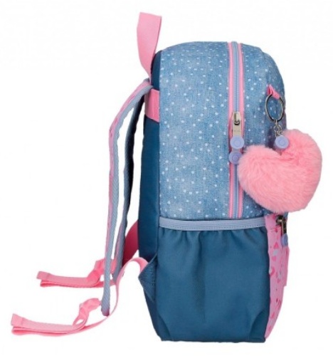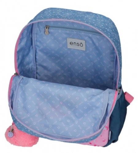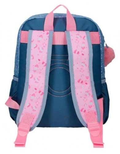 Tiene un compartimento principal, un bolsillo en la parte delantera y dos bolsillos laterales ideales para botellas de agua o material escolar.